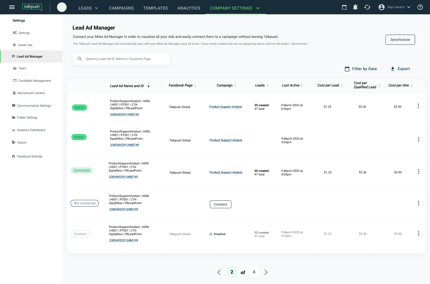 Gain valuable insights and take control of your recruitment campaigns using the Talkpush Lead Ad Dashboard. Our comprehensive platform allows you to track and analyze all your paid advertising efforts in one centralized location. By monitoring key metrics such as conversion rates and click-to-hire ratios, you can evaluate the effectiveness of your campaigns and make data-driven decisions to improve outcomes.